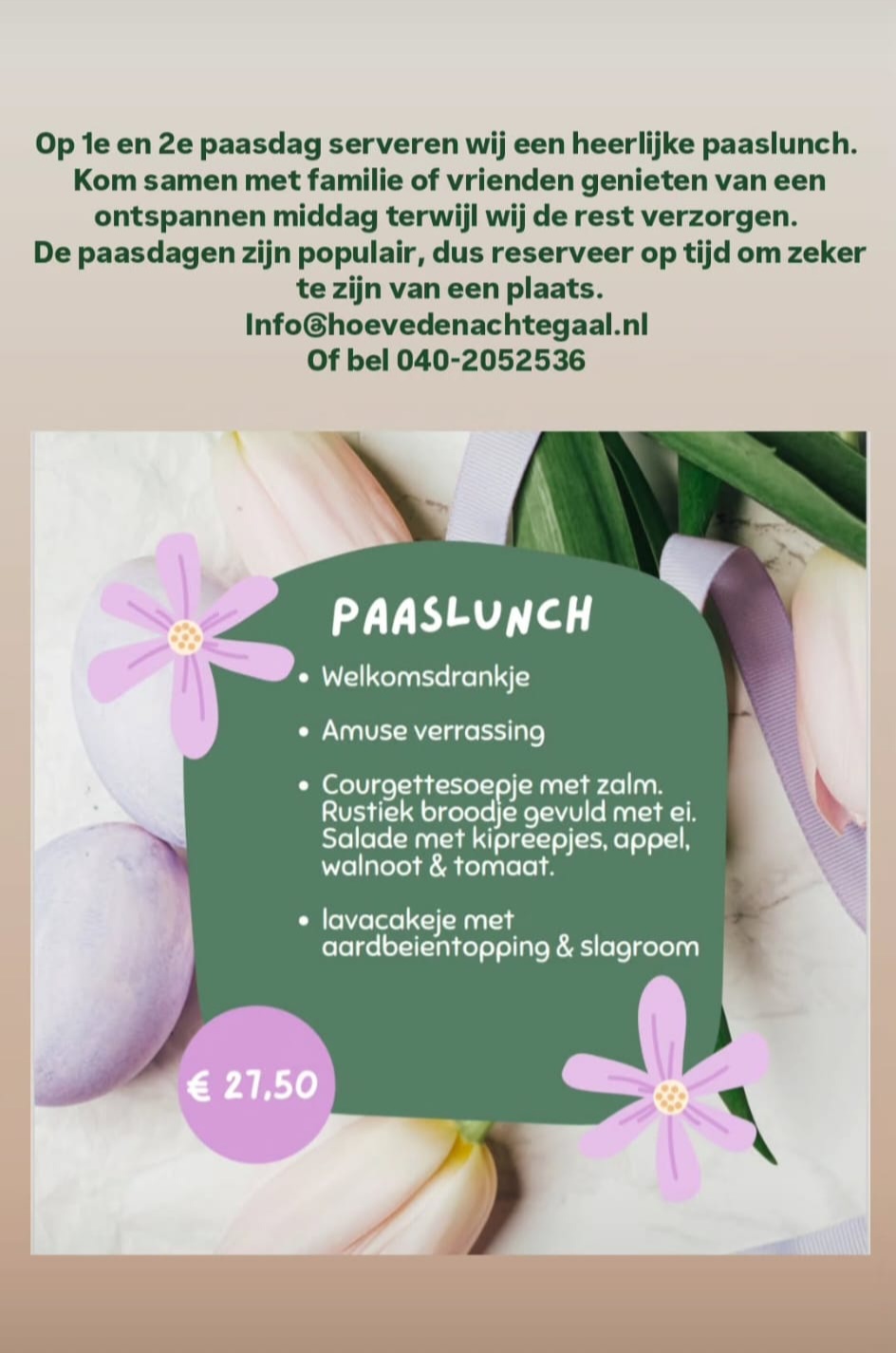 Op 2e kerstdag organiseren wij tussen 11:30 en 14:30 uur een gezellige kerstbrunch in buffet-vorm. Gezellig met elkaar, het gezin, familie en of vrienden een zorgeloze kerstbrunch in een sfeervolle omgeving….. dat is pas het echte kerstgevoel… Volwassenen €36,50, kinderen €17,50. Opgeven kan via info@hoevedenachtegaal.nl of bellen op 040-2052536